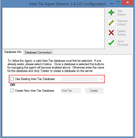 Once those credentials are entered, the Inter-Tax Agent will open. From here, the Agent can be configured to use the migrated Inter-Tax database. Because all of the extraction settings are stored within the migrated Inter-Tax database, no other steps are required. To point the Agent at the proper database, execute the following steps: