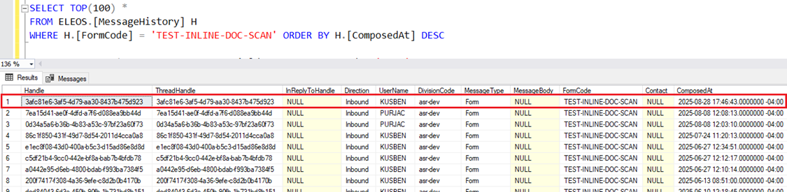 Because these scans are completed inline on the forms themselves, information on these specific types of document scans can be found audited within the standard ELEOS.DocumentHistory and ELEOS.DocumentFields tables and within ELEOS.MessageHistory and ELEOS.MessageFields tables too. For example, if searching for the most recent inline scans, coming from an identifiable Form Code (Ex. “TEST-INLINE-DOC-SCAN”), we can query to search for the most recent of these in the Eleos.MessageHistory table which would look something like the following: