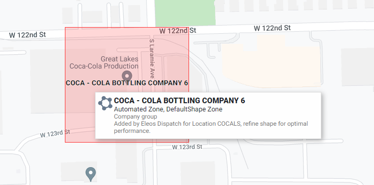 Figure 2. Here you can see within MyGeotab an example of an automated zone also indicated by the comment stating added by Eleos Dispatch.