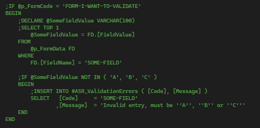 If the integration responds with a 200 OK when making a sever validation request, this means that the fields of the form have been validated against the ELEOS.usp_ValidateMessage procedure, and has no issues reported. This form is considered valid to us.