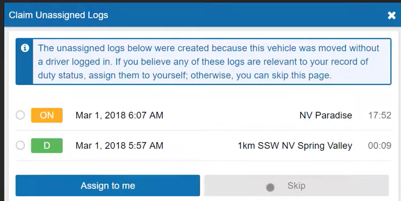 *Disclaimer: Please check with your Geotab Reseller to see if your Geotab environment has specific password requirements (such as AT&T CSO). Certain password requirements like length minimums, letter casing, impacts automated provisioning done through the Geotab API which may prevent you from using integrated designs (i.e. your Geotab password will not have the ability to match the Eleos password with padding, drivers will have to adhere to the reseller database requirements for password security). * - The driver that just logged in may be asked to ‘Claim Unassigned Logs’ and may click ‘Skip’ if none apply.