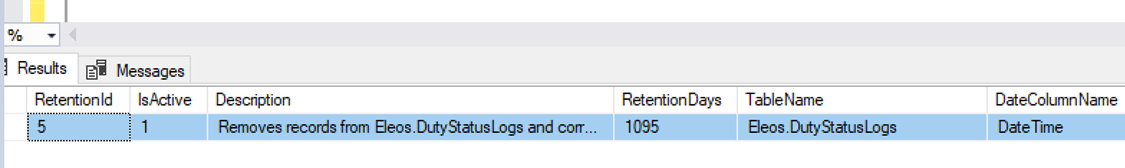 The above example enabled and configured the retention setting for the ELEOS.DutyStatusLogs table so that records greater than three years old or 1095 days are deleted. This will also delete corresponding records from the ELEOS.TelematicsClockEvents table that join on the same DutyStatusLogId value as defaulted in settings