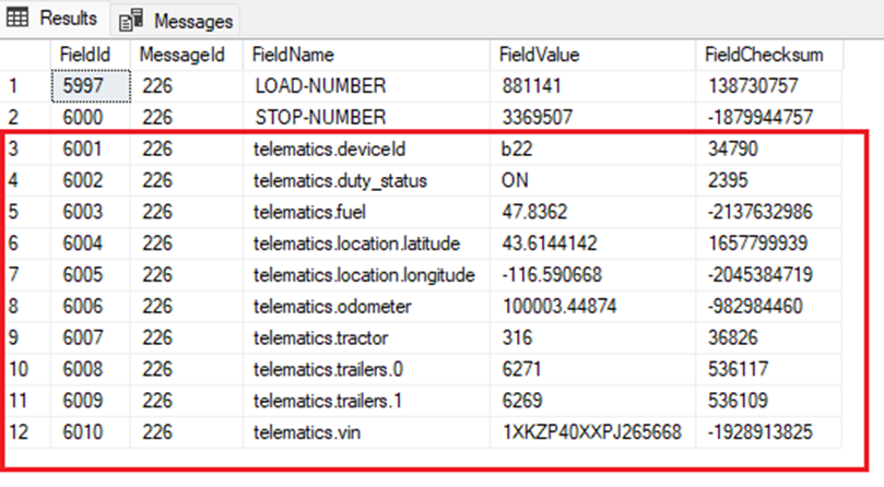 The GeotabTelematicsMessageProcessor is a configurable service within the integration that is triggered during inbound message processing and is responsible for adding telematics data retrieved from Geotab to Form type messages allowing this information to be audited within the database. This audited telematics data provides valuable historical context at the date and time of a form submission including details such as the driver’s duty status, assigned tractor and trailers, vehicle location by latitude and longitude, and more: